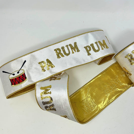 Pa Rum Pum Gold Sequin Embroidery w/ Drum on Ivory Velvet Ribbon 4” x 10yd | IR