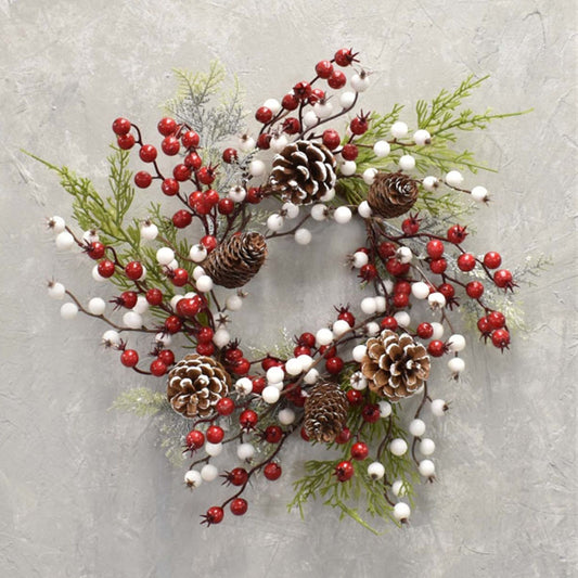 Set of 2 Snow Touched Cypress, Cedar, Pine Cone Wreath with Red & White Berries 20" in Red White Green | QDC22