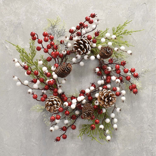 Snow Touched Cypress, Cedar, Pine Cone Wreath with Red & White Berries 20" in Red White Green | QDC22