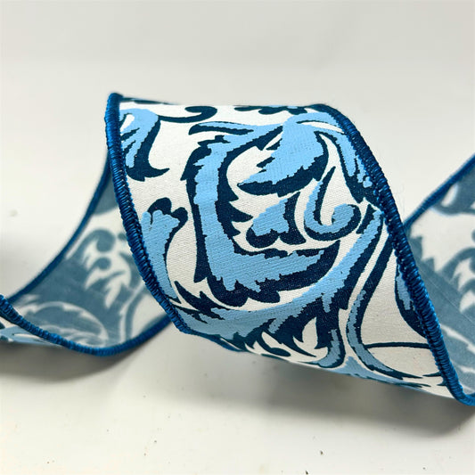 Elegant Acanthus Faux Canvas Ribbon 2.5"X 10YD-Blue/White Ribbon | IR