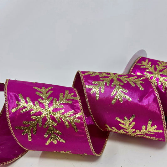 Gold Sequin Snowflake Print on Fuchsia Metallic Ribbon 4” x 10yd | IR