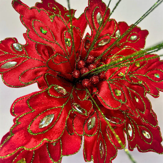 Glitz Gem Velvet Poinsettia Stem - Red/Green 27” | KS