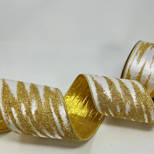 Gold Abstract Towel Embroidery on White Faux Dupioni Ribbon w/ Gold back 4” x 10yd | IR
