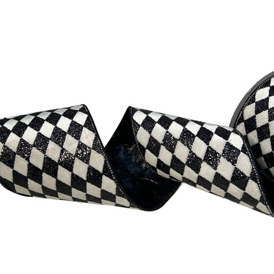 White Velvet w/ Black Glitter Diamond Pattern Ribbon 4” x 10yd | IR