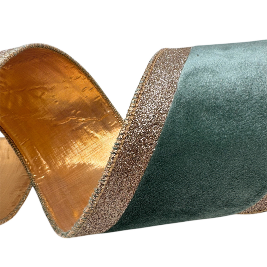 4”X10 YD Celadon Velvet ribbon with rose gold glitter stripe on the edge with rose gold lame back an
