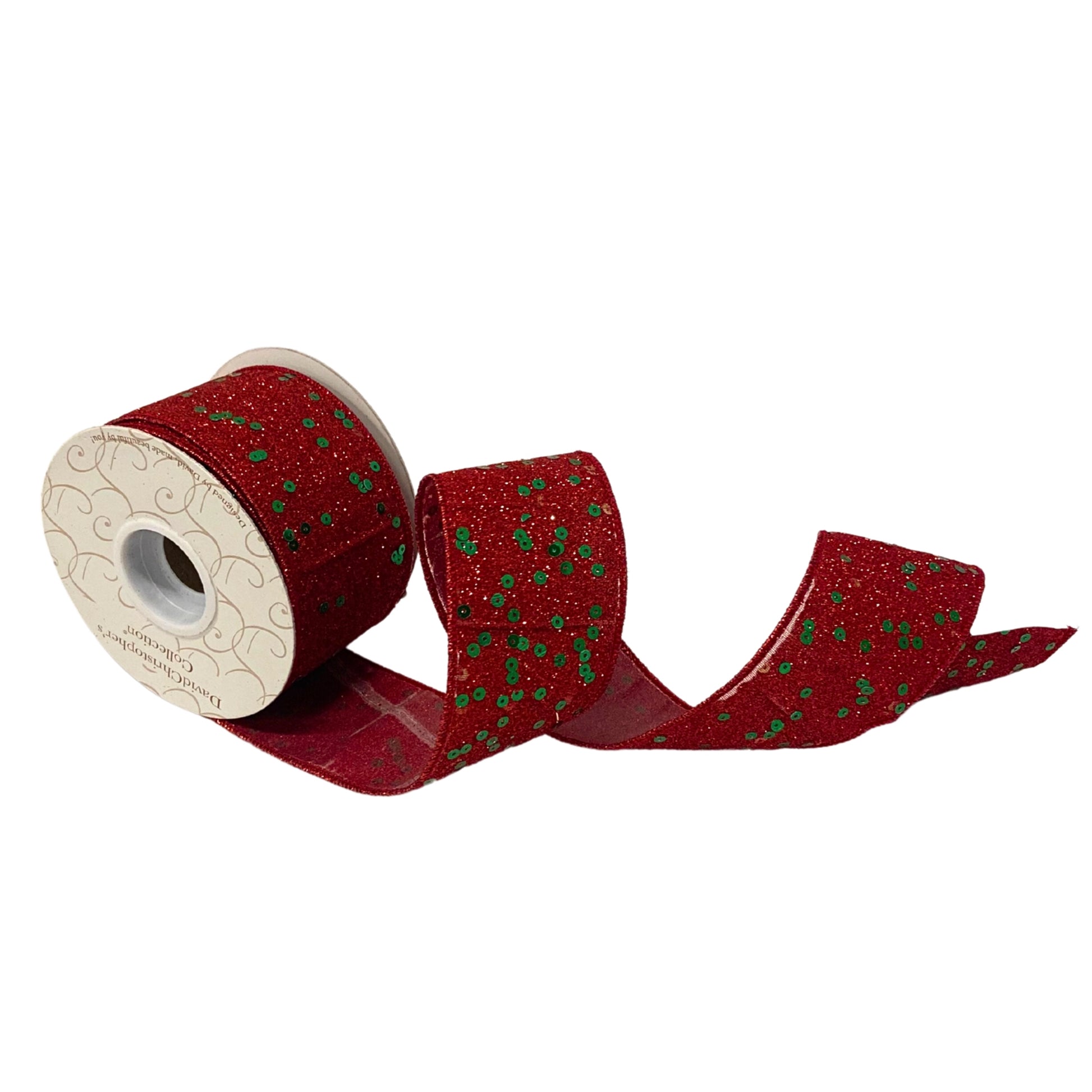 2.5”X10YD Red Full Glitter with Green Sequin Printed on Red Dupioni