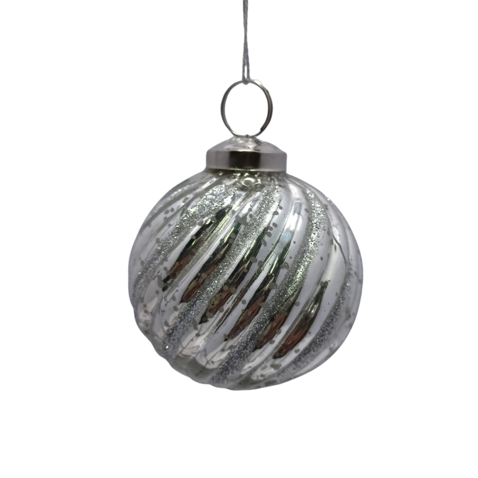 Brighten up your Christmas tree with these 6 elegant silver Mercury Glass ornaments. Each 3" ball is handcrafted with a glitter design, providing a shimmery and sophisticated touch to your decorations. Enjoy the classic style of these ornaments all season.