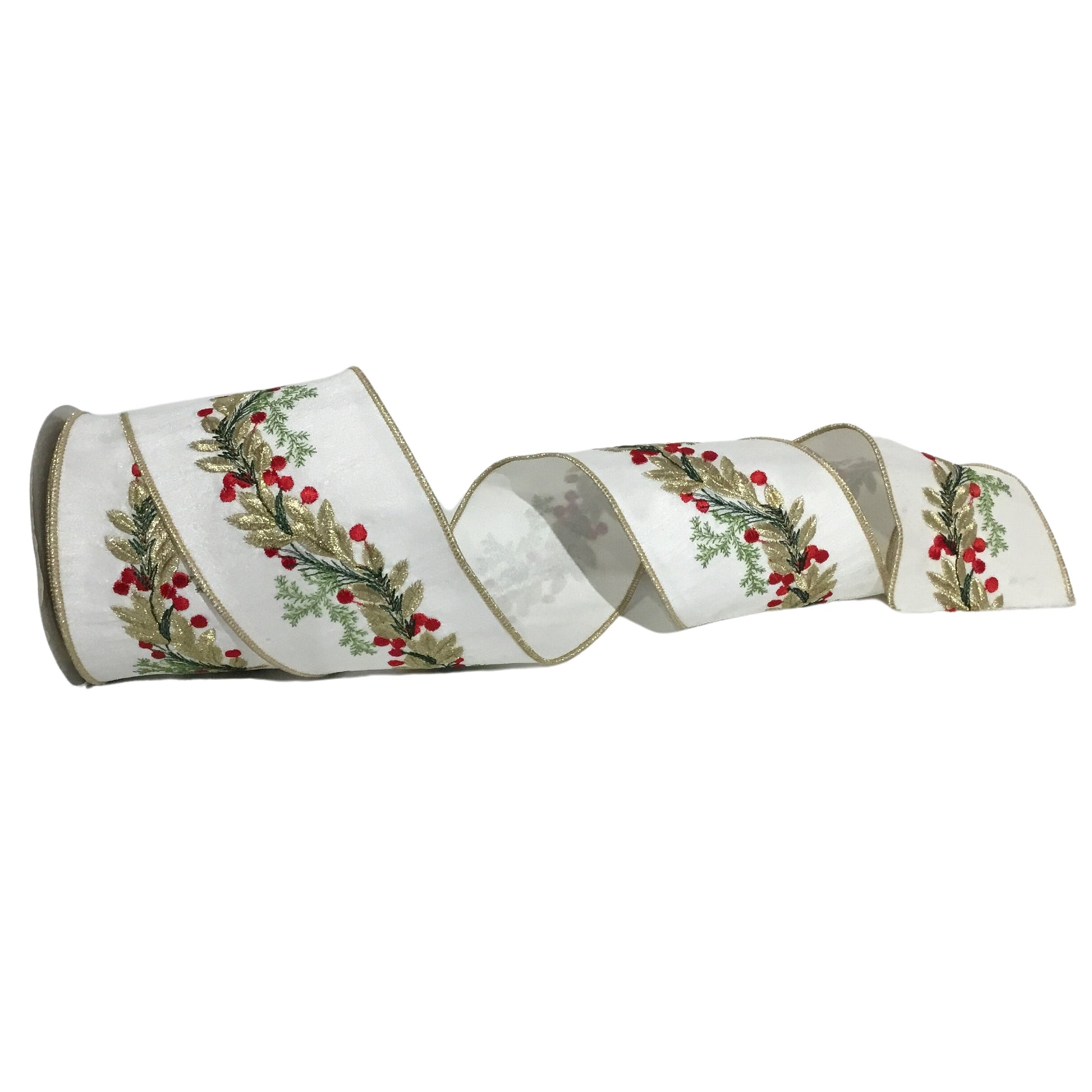 Berry Leaves Embroidery on White Dupioni Ribbon w/ White back/Gold edge 4” x 10yd | IR