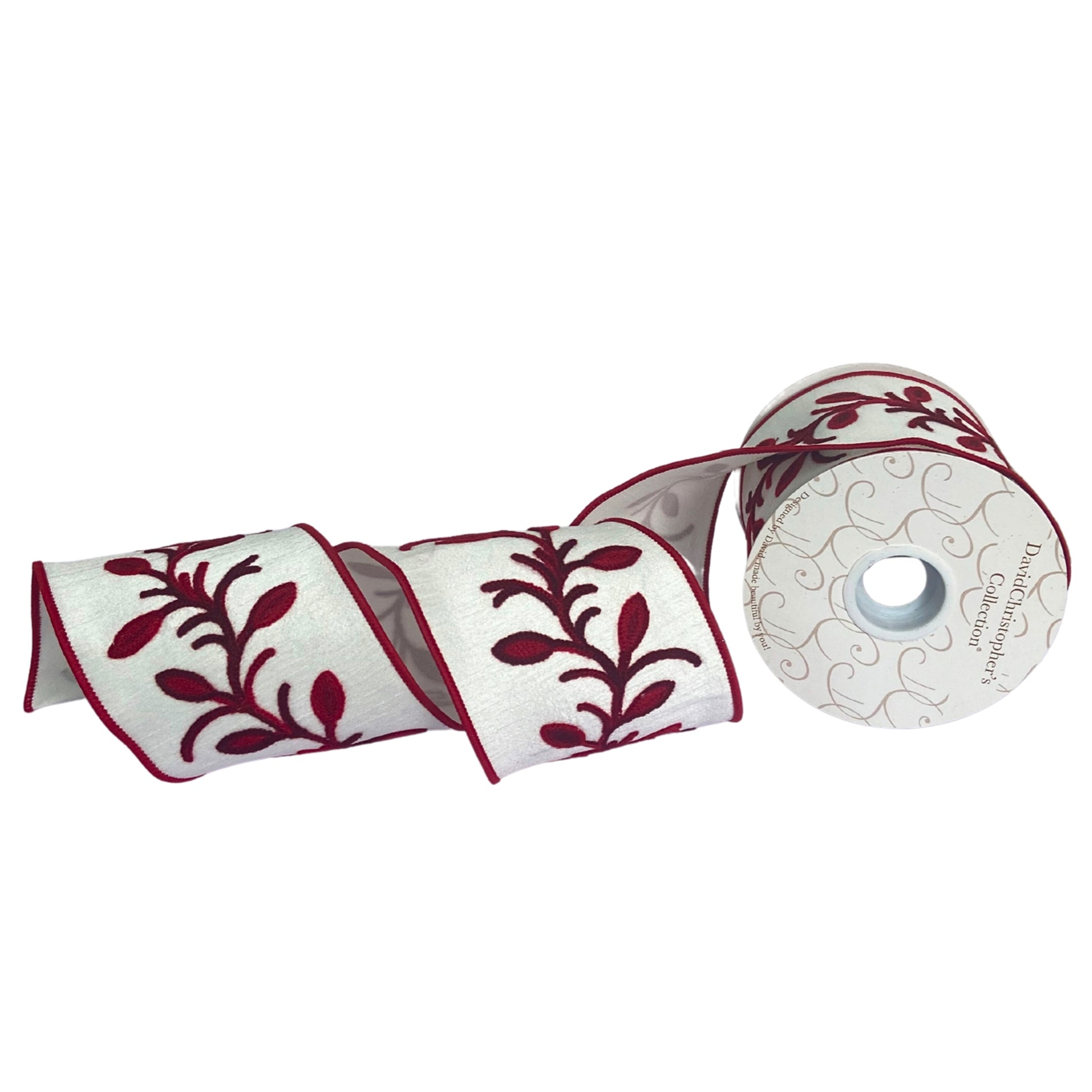 Red Leaf Chain Embroidery on White Dupioni Ribbon w/ White back/Dark red edge 4” x 10yd | IR