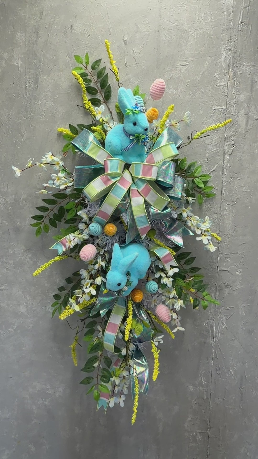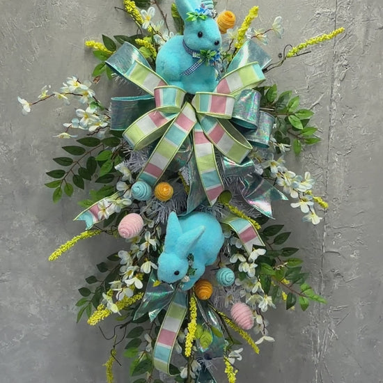 Bring springtime charm to your home with this ready-to-hang Playful Bunny Teardrop. Measuring 51" x 25", this whimsical piece features adorable bunny details perfect for Easter décor and seasonal displays. The teardrop shape adds elegant dimension to any room, while the completed design means instant installation. Ideal for entryways, living spaces, or as a festive gift for bunny lovers.