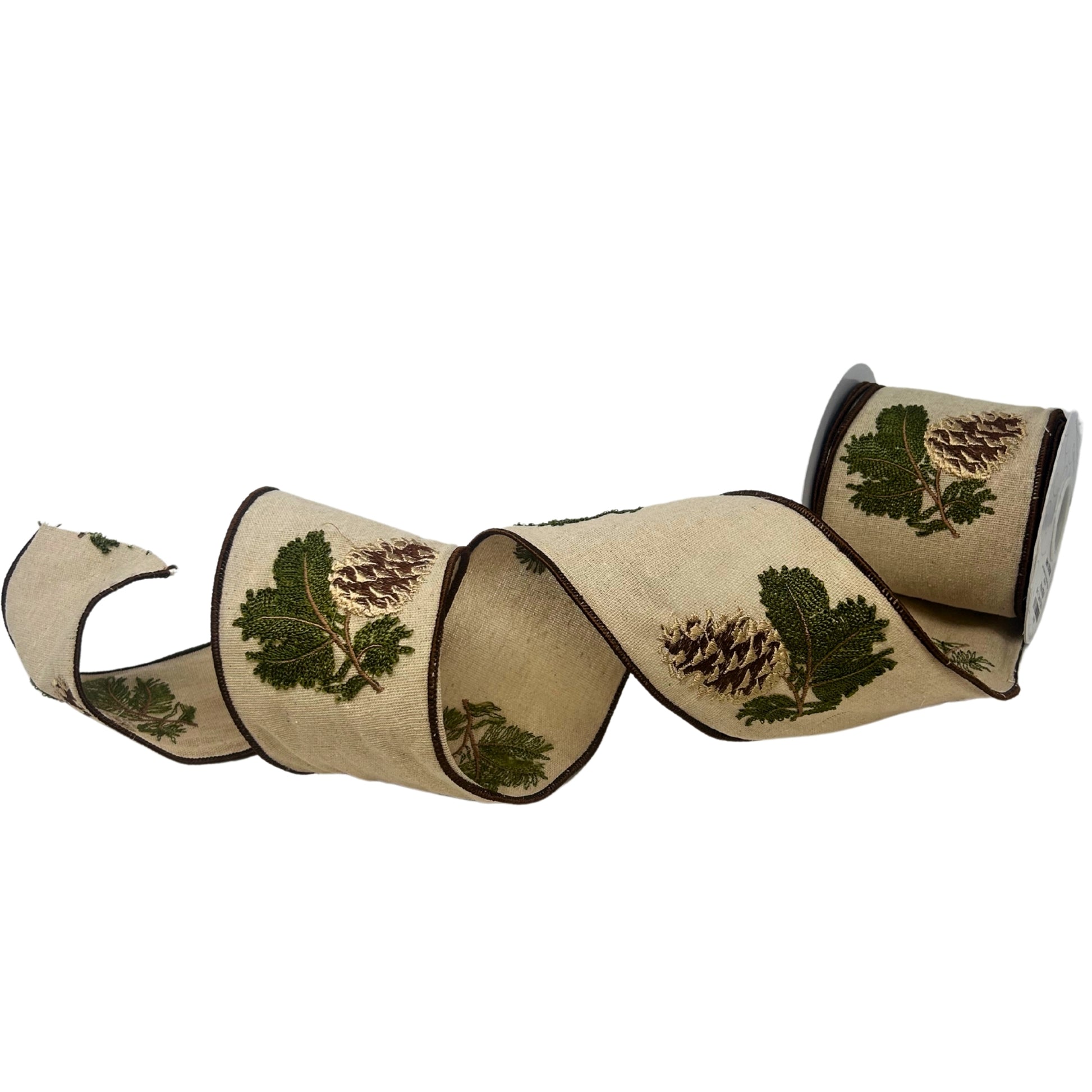Pinecone w/ Leaves Embroidery on Natural Dupion Ribbon 4” x 10yd | IR