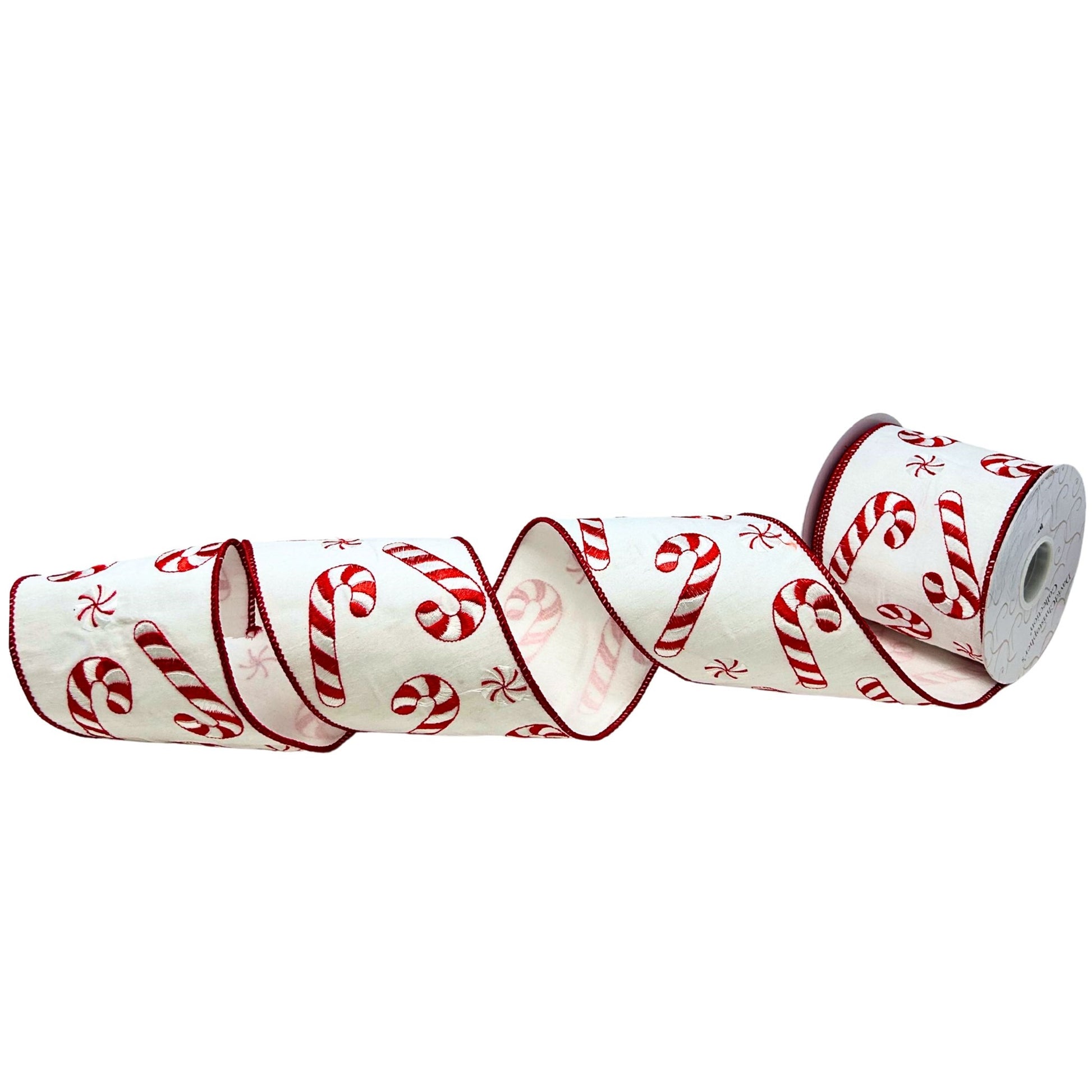 Candy Cane Embroidery on White Ribbon 4" x 10yd | IR