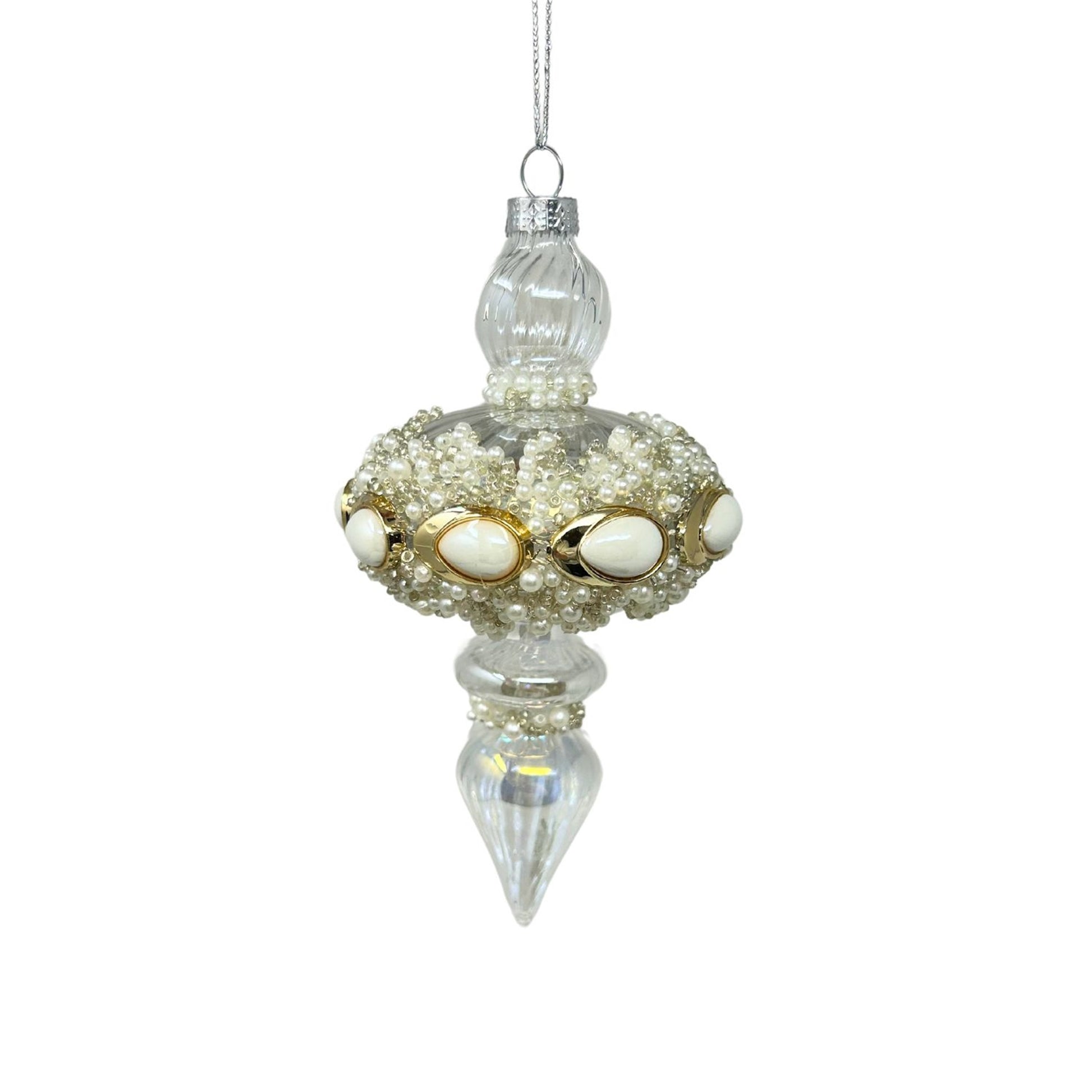This clear glass pearl bead finial ornament measures 5.5 inches, featuring an elegant, elongated shape adorned with lustrous pearl-like beads. Its sophisticated design and shimmering finish make it perfect for trees, wreaths, garlands, or refined holiday décor.