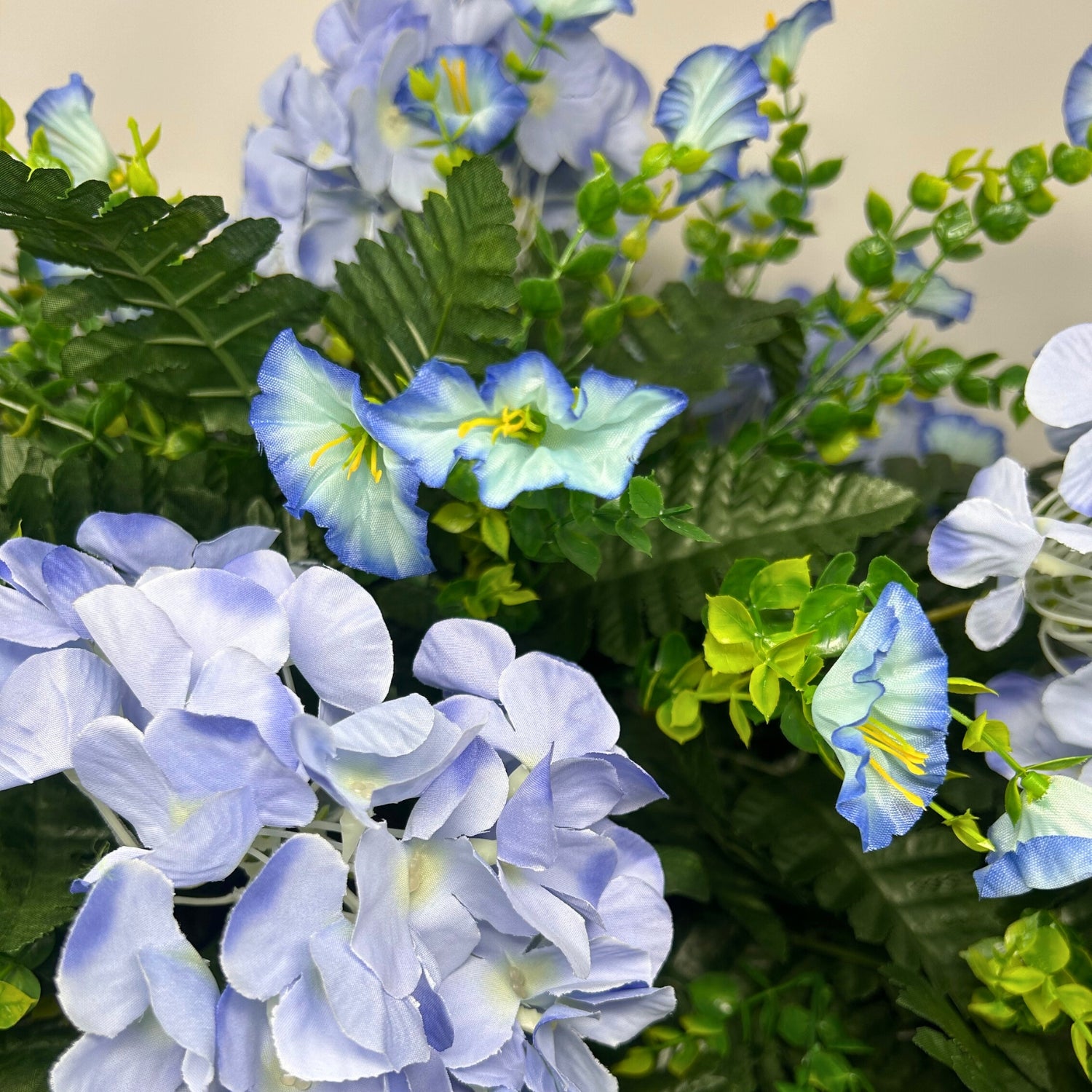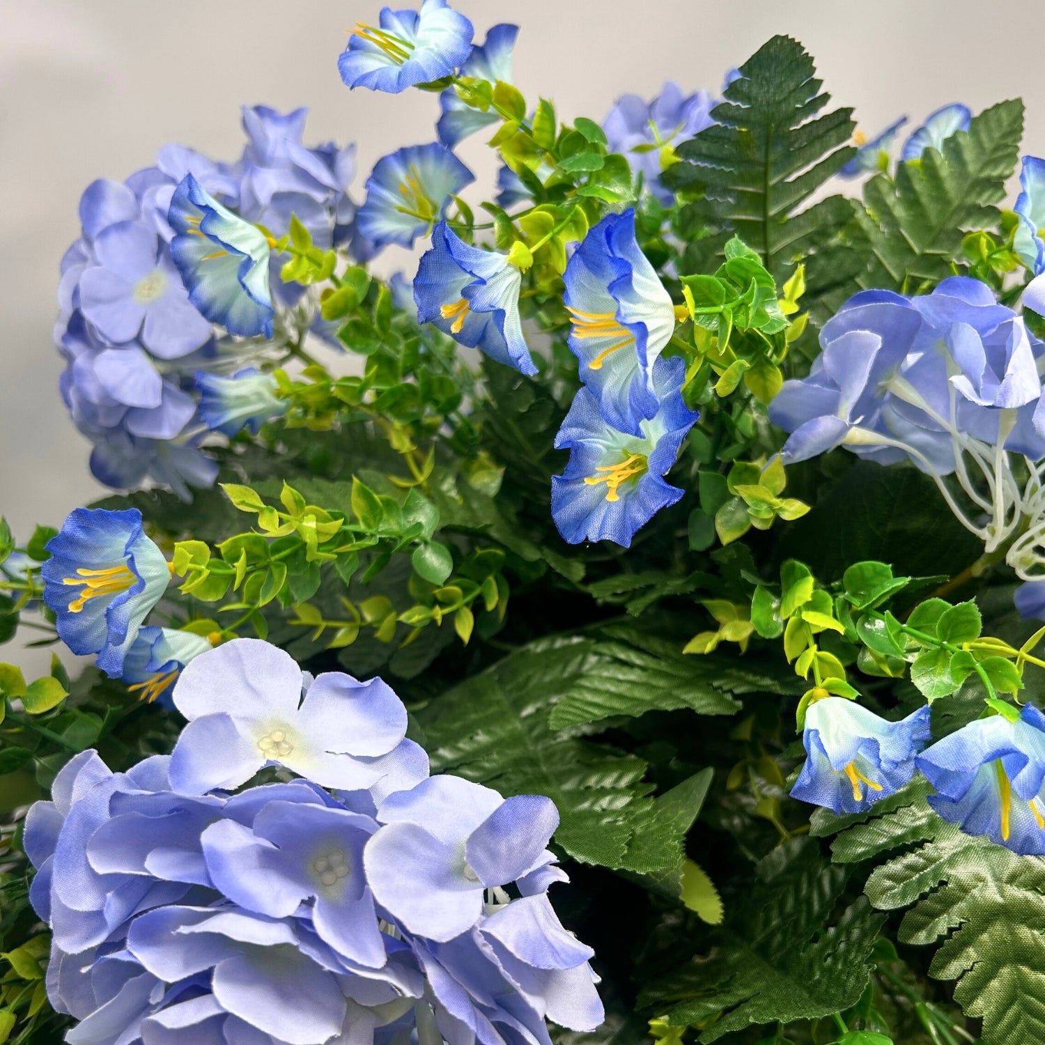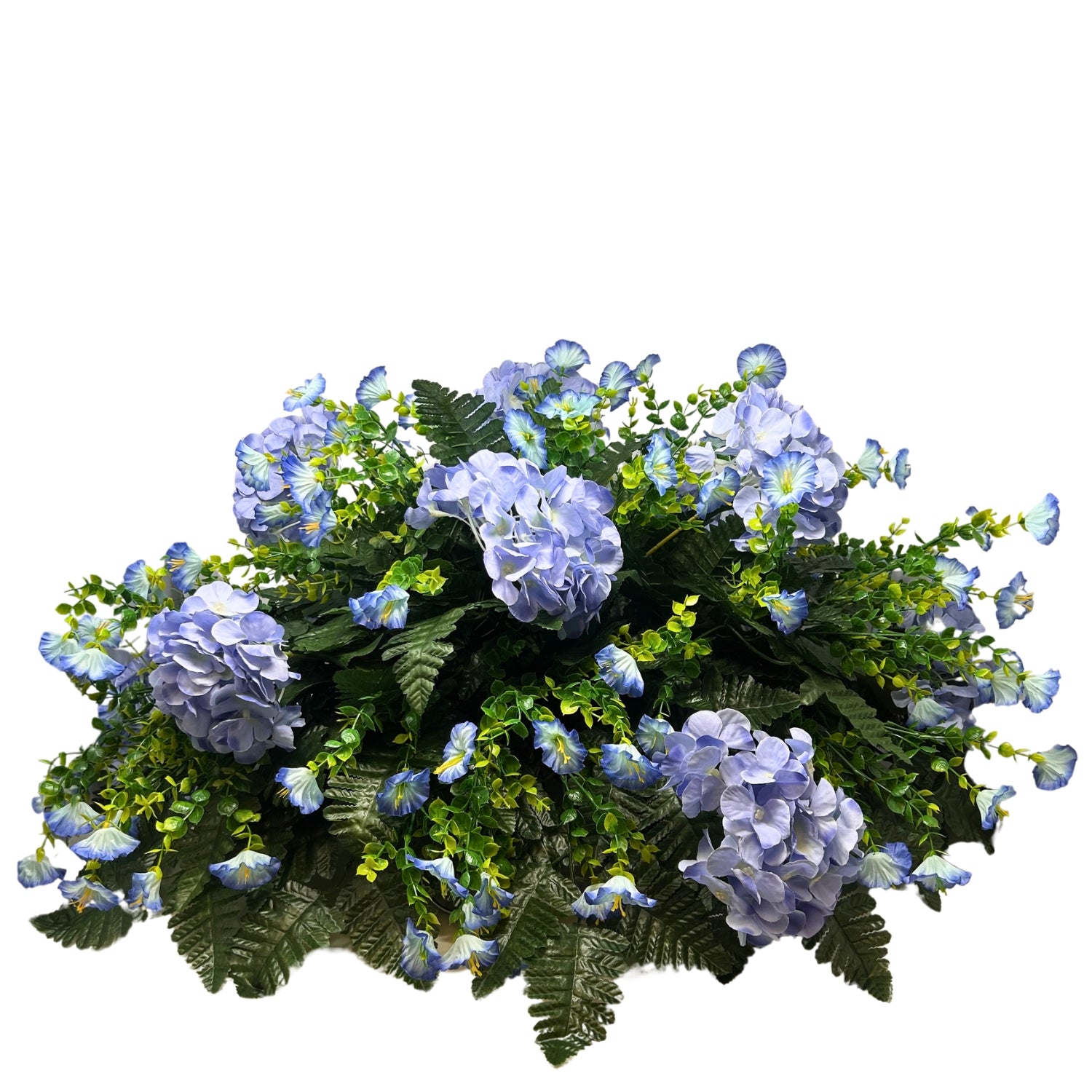 Coastal Breeze Pre-Made Saddle brings timeless elegance to cemetery tributes. This blue floral arrangement features a carefully curated blend of seasonal blooms and greenery, designed to rest gracefully on grave markers. Weather-resistant materials help the arrangement maintain its beauty throughout the seasons.