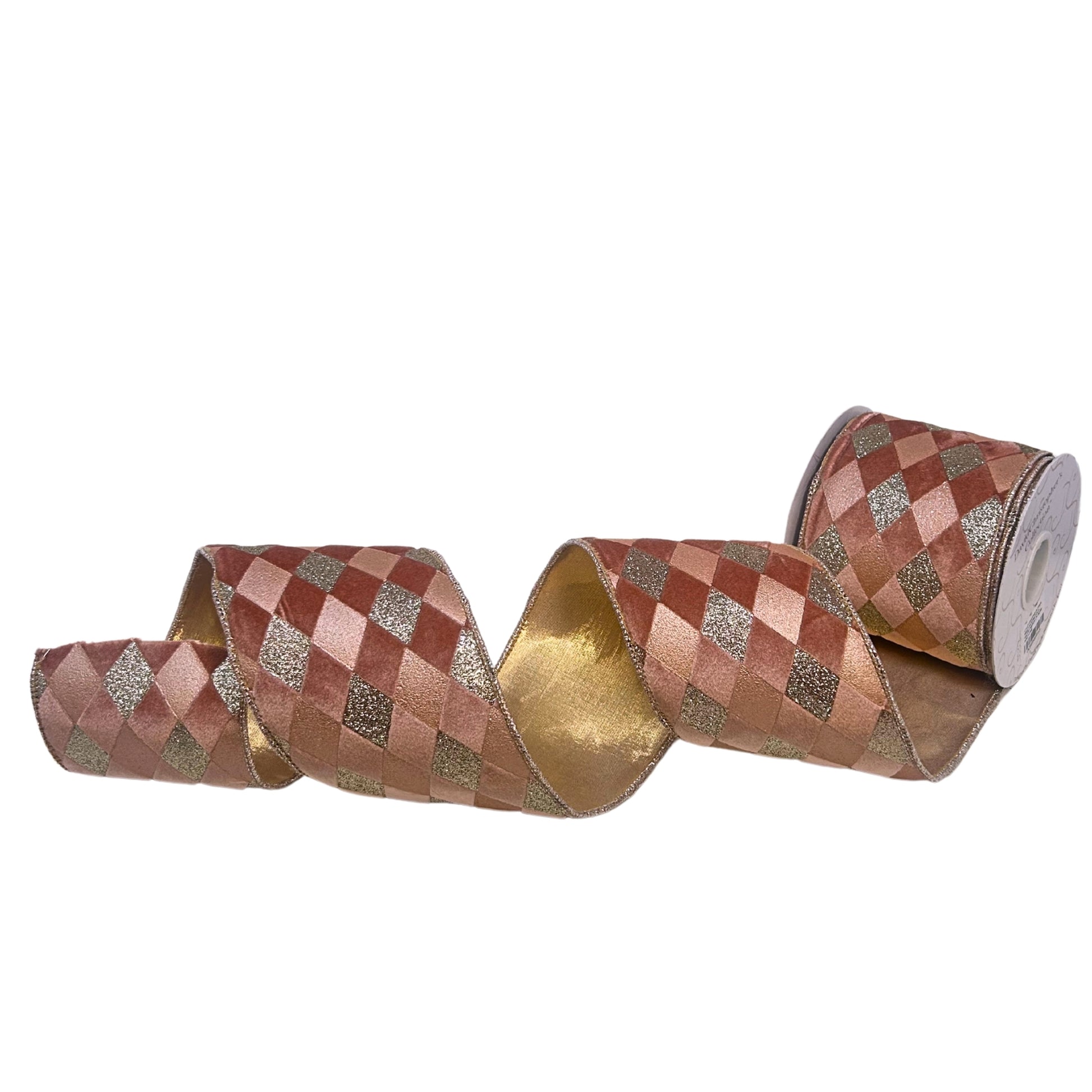Champagne Diamond Glitter Print on Rose Pink Velvet Ribbon w/ lame back 4” x 10yd | IR