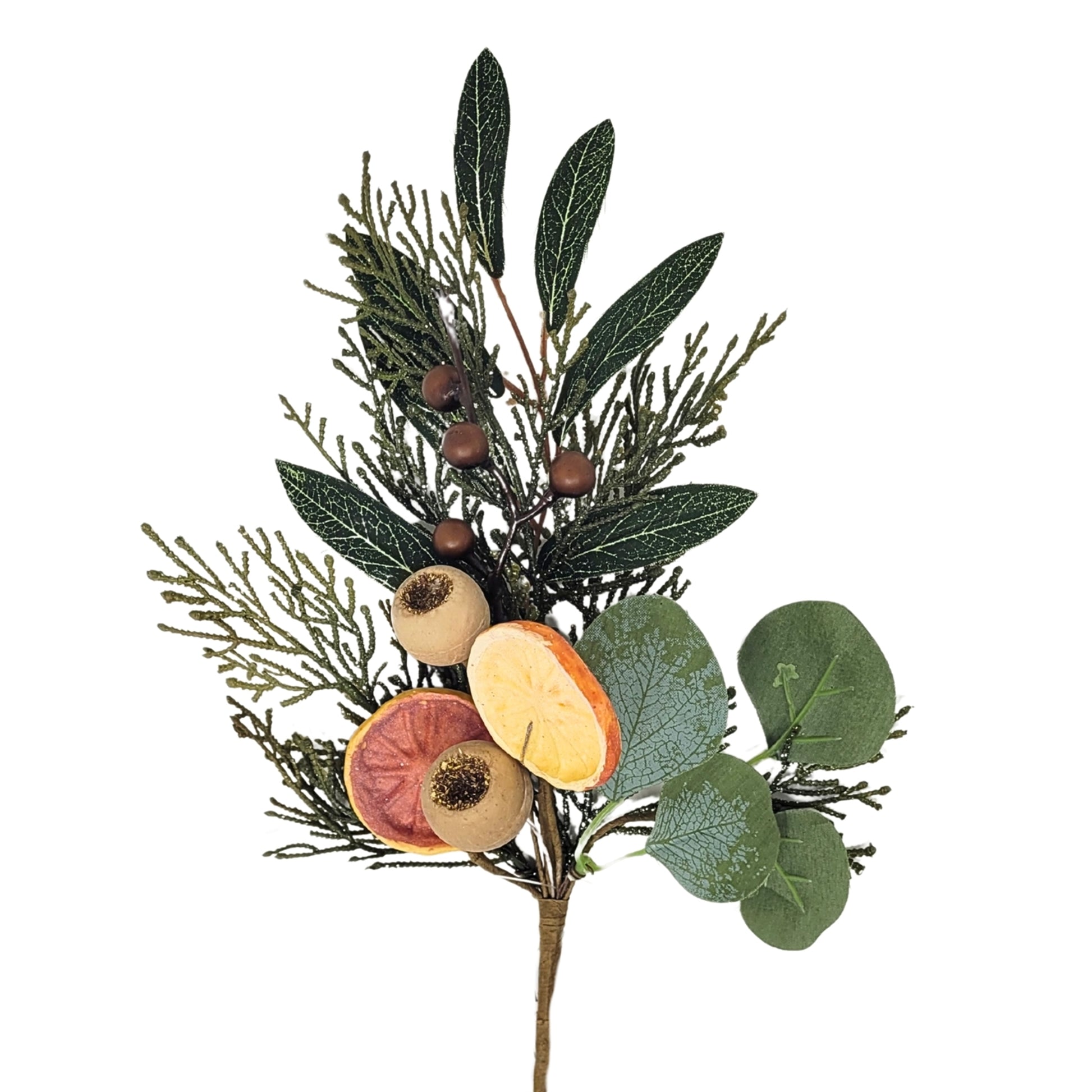 Elevate your seasonal décor with this 13-inch Faux Orange Slice Cedar Spray. Expertly crafted to mimic the natural beauty of dried orange slices combined with lush cedar sprigs, it adds a sophisticated, rustic touch to wreaths, centerpieces, or mantel displays. Durable and maintenance-free, this spray offers lasting charm without the mess or fragility of real botanicals. Perfect for enhancing holiday arrangements with a warm, inviting aroma-inspired look.