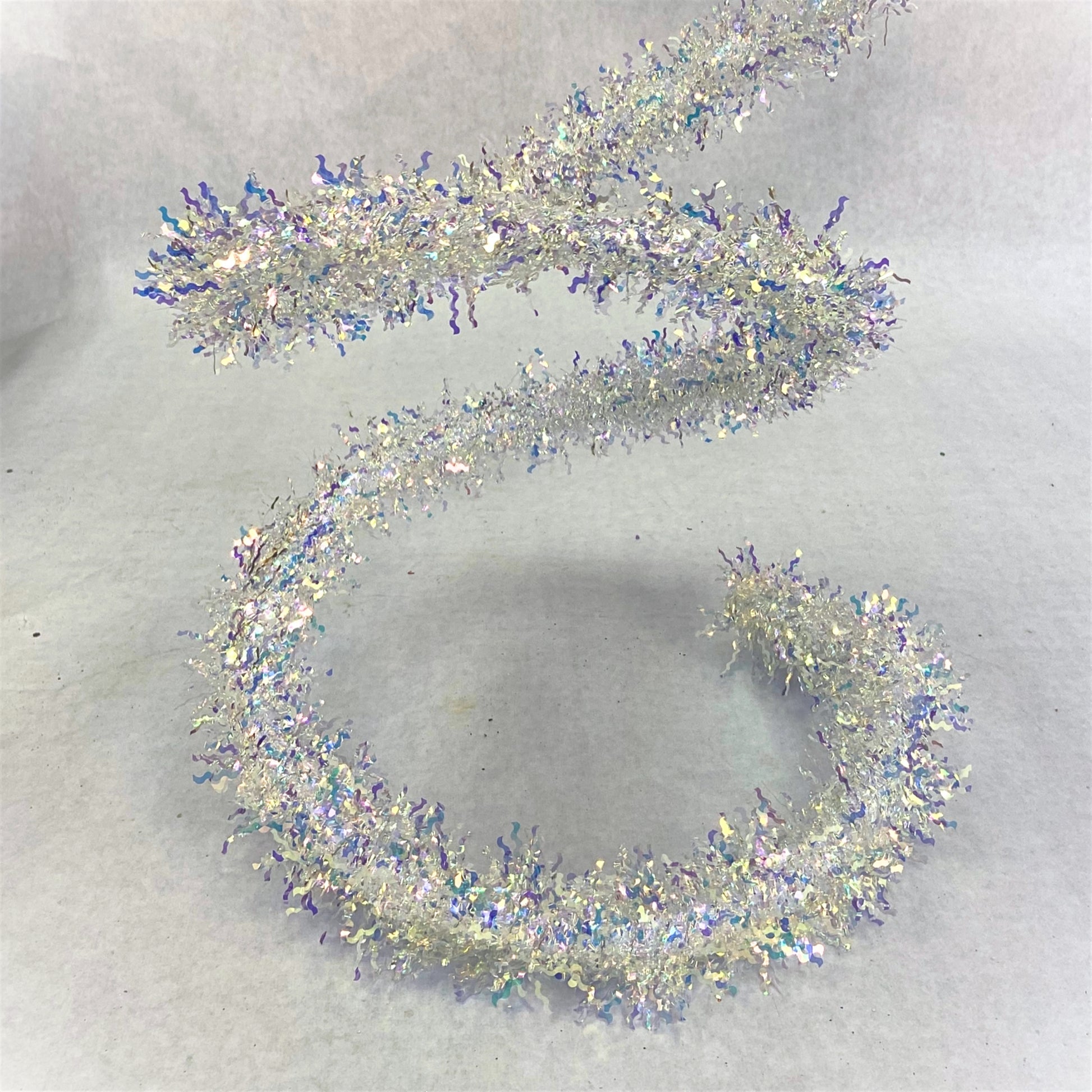Add sparkle and shine to your special occasion with this 6-foot long white iridescent tinsel garland. Its light-catching holographic finish provides a bright and eye-catching display, making it perfect to use in any indoor or outdoor decor.