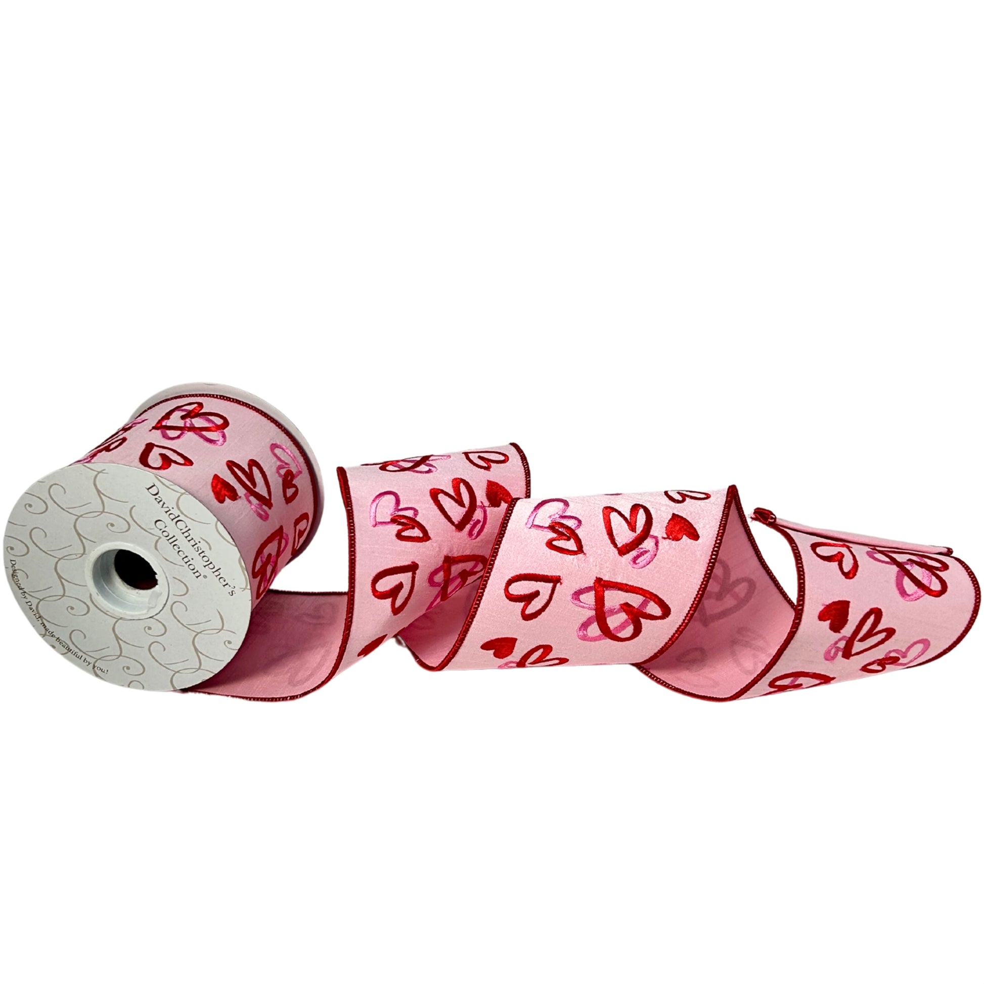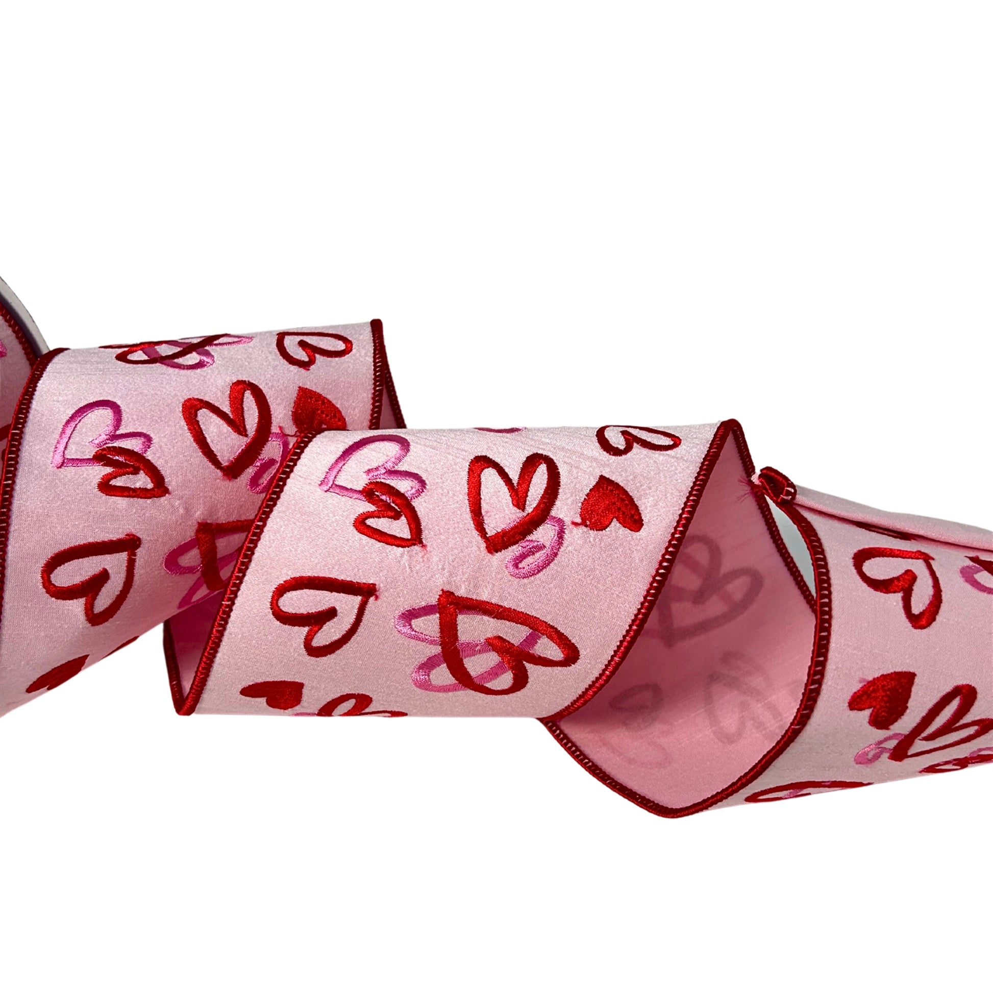 Pink Faux Dupioni w/ Embroidered Pink and Red Hearts Ribbon 4” x 10yd | IR