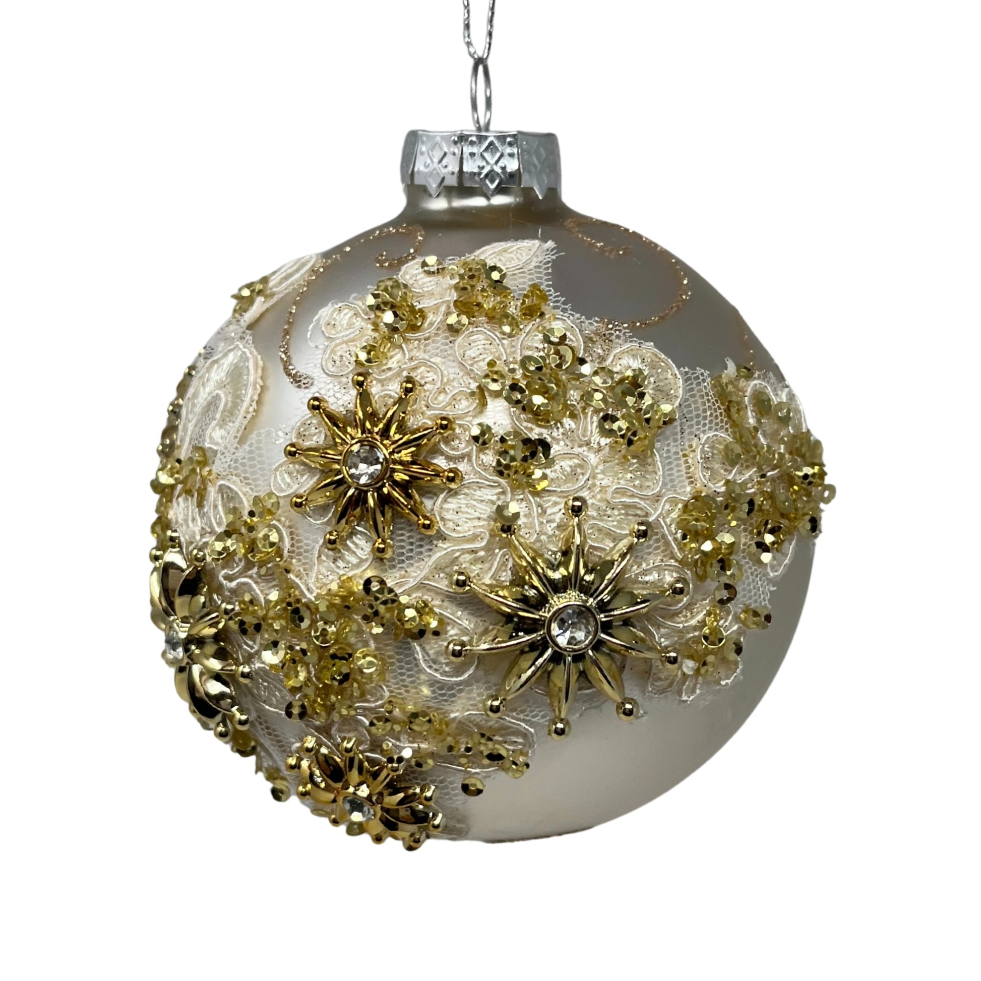 This glass ball ornament measures 4 inches and features an ornate floral print enhanced with delicate lace and shimmering metallic accents. Its intricate design and soft hue make it a refined addition to trees, wreaths, garlands, or elegant holiday décor.