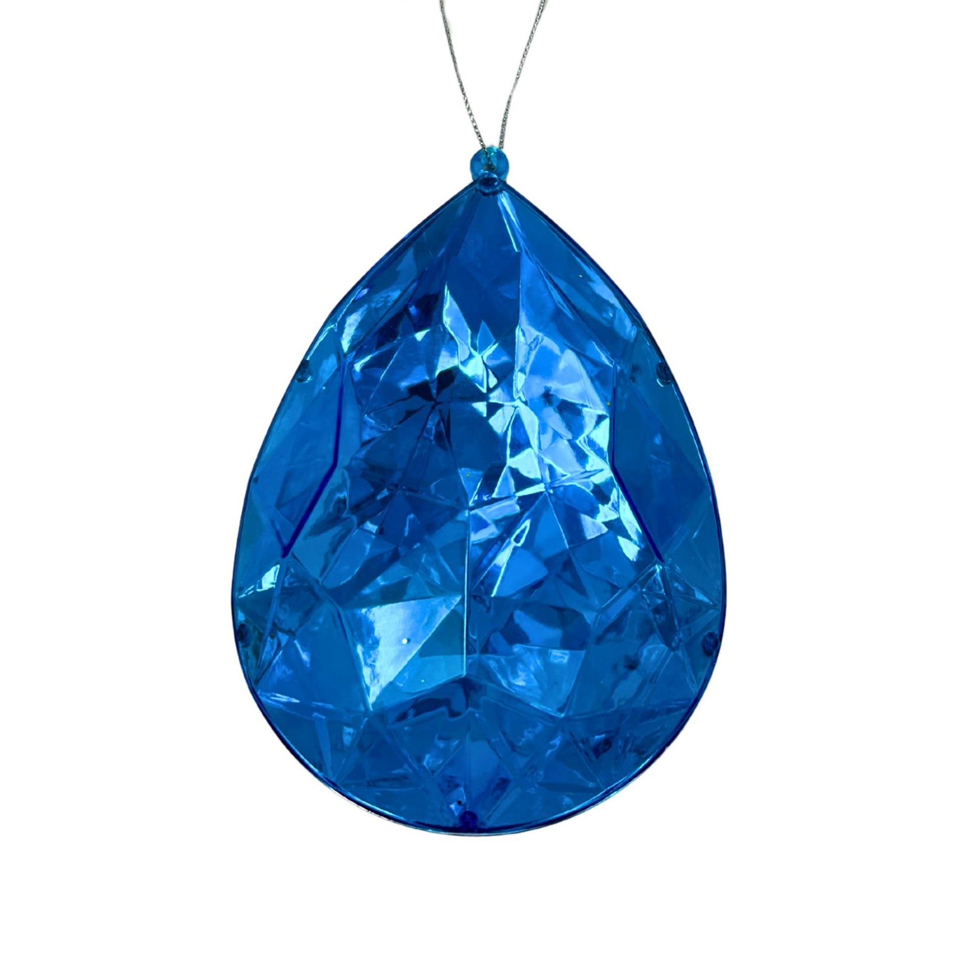 This blue drop diamond ornament measures 4 x 2.4 x 6 inches, combining modern elegance with a warm metallic glow. Crafted from durable plastic, its faceted teardrop shape catches and reflects light beautifully—perfect for adding a sophisticated touch to trees, wreaths, garlands, or event décor.