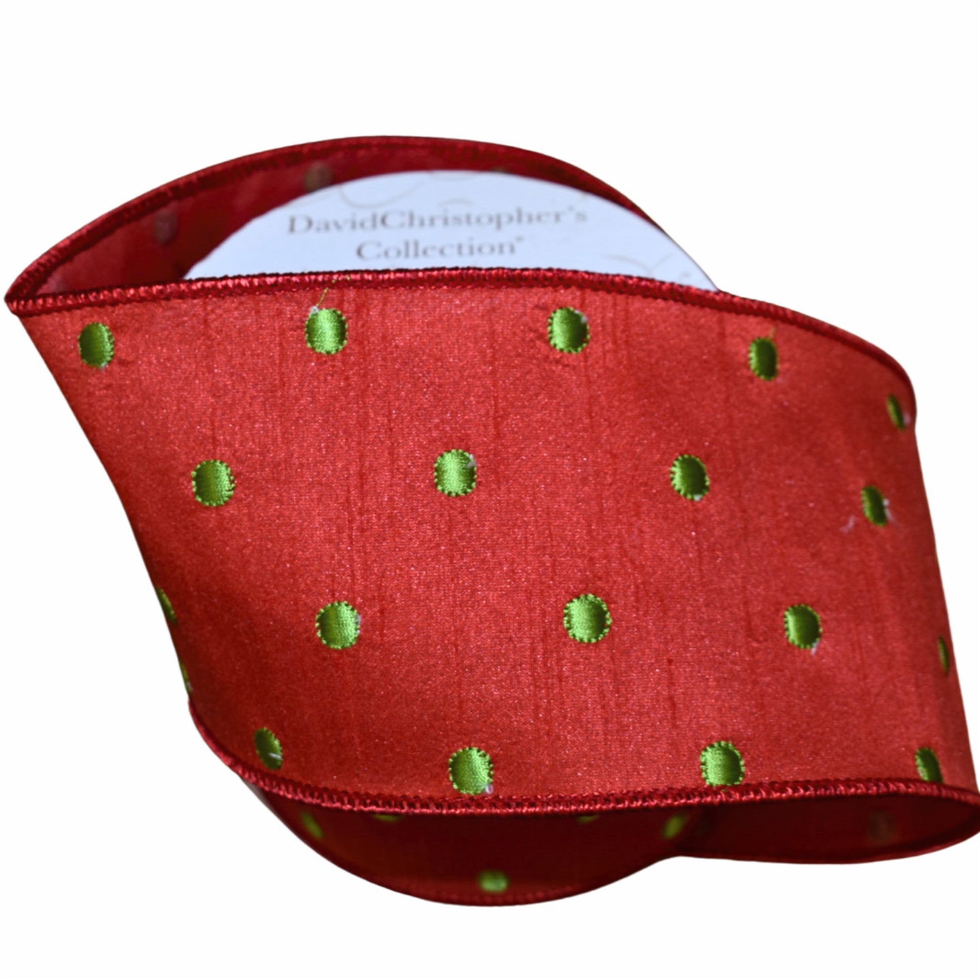 Red Faux Dupioni Ribbon w/ Green Embroidery Dots 4" x 10yd | IR