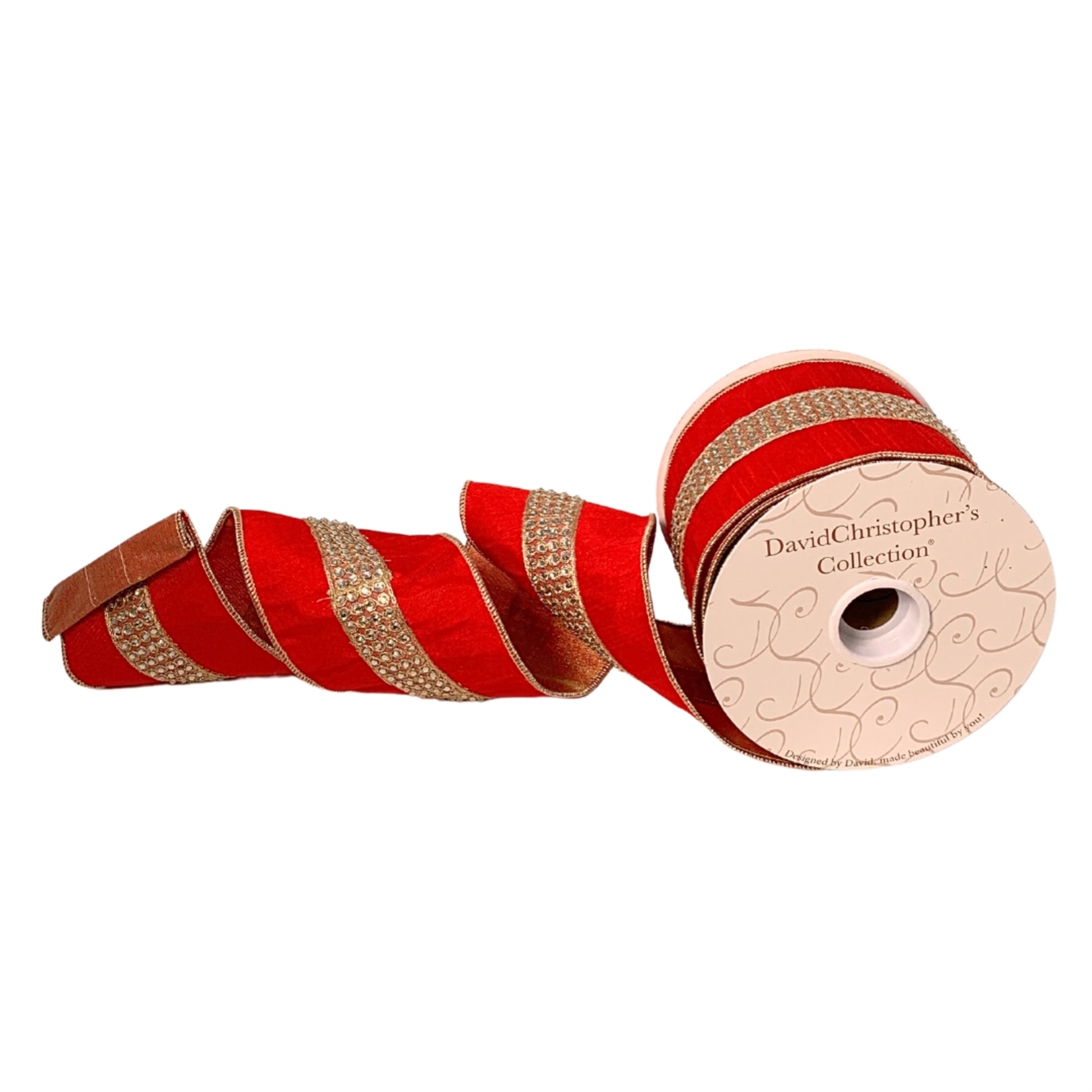 Red Faux Dupioni w/ Rhinestone Center Stripe Ribbon 4” x 10yd | IR