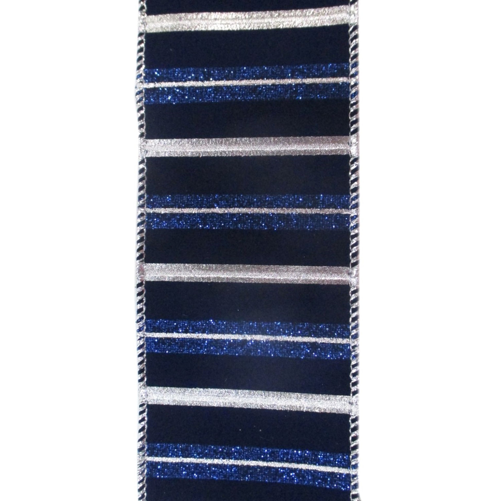 Glitz up your craft projects with this Royal Stripe Silver/Blue Ribbon. The 2.5” x 10yd roll is covered in glitter that will surely give your projects the perfect touch of sparkle. Perfect for a variety of uses.