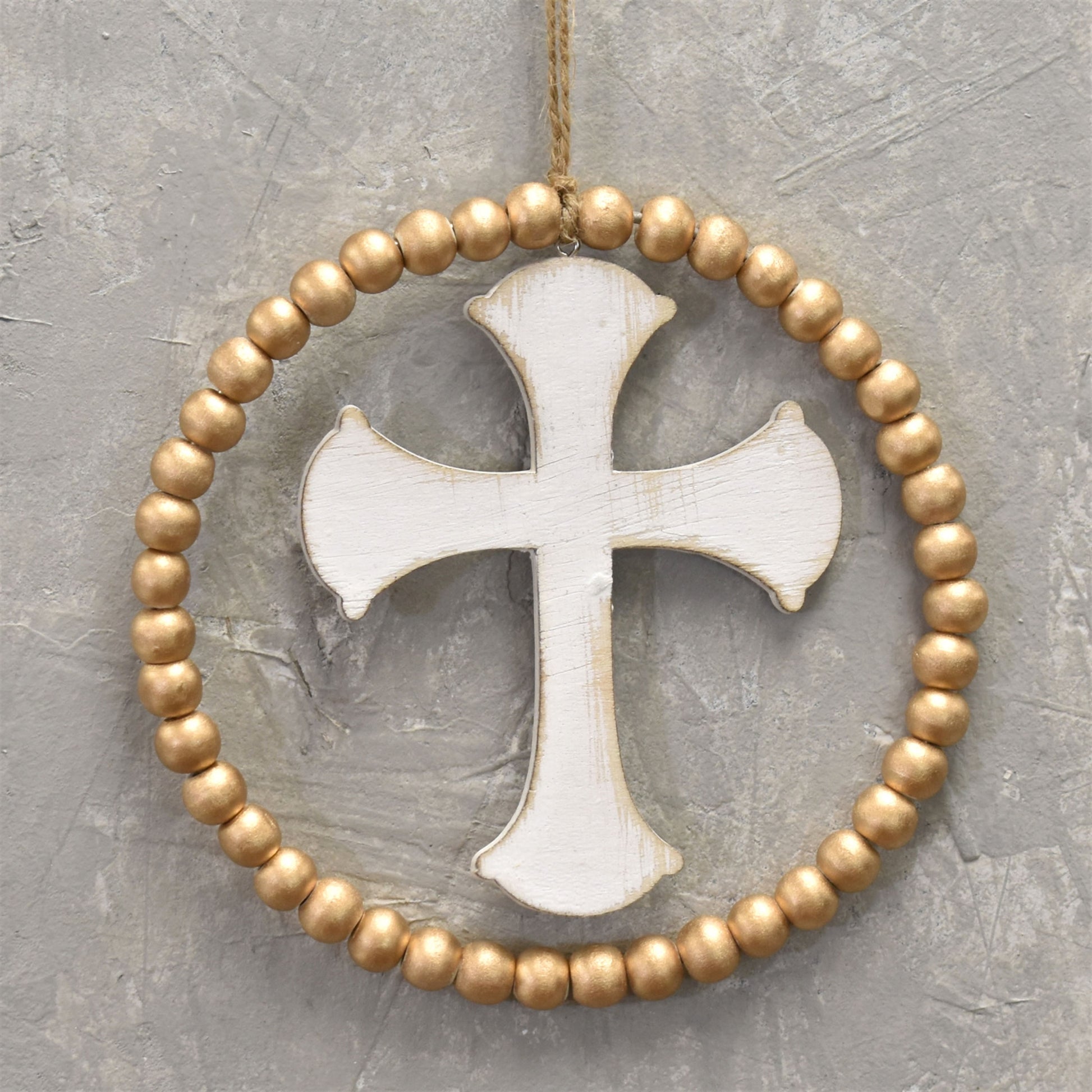 Spiritual Wooden Cross And Bead Ornament 6" in Gold Ivory | BFC22