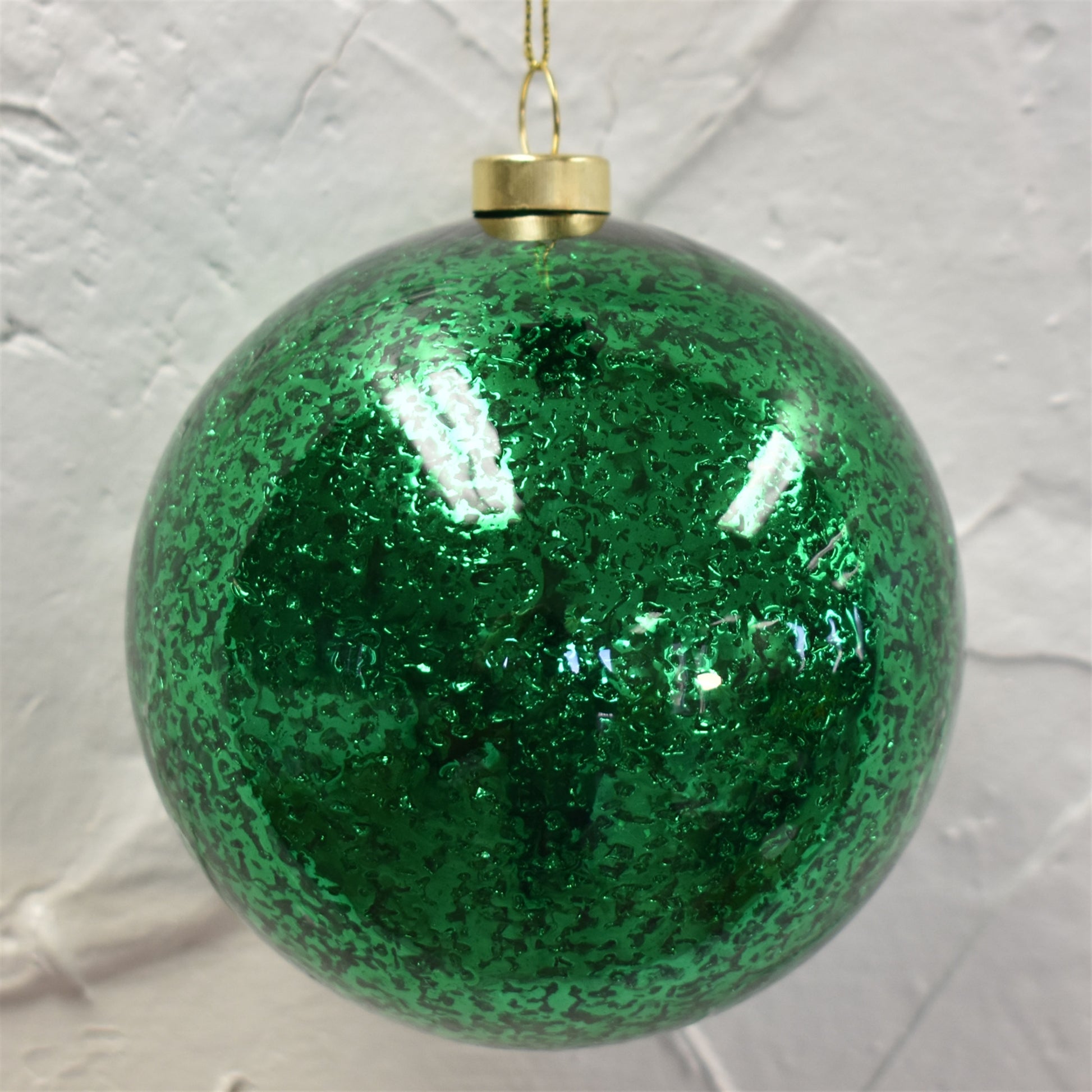 This classic ball ornament adds a timeless touch to any holiday display. The 4" diameter glass globe boasts a textured surface and an antique finish for a sophisticated look. The deep emerald color adds richness and sparkle to any holiday decor.