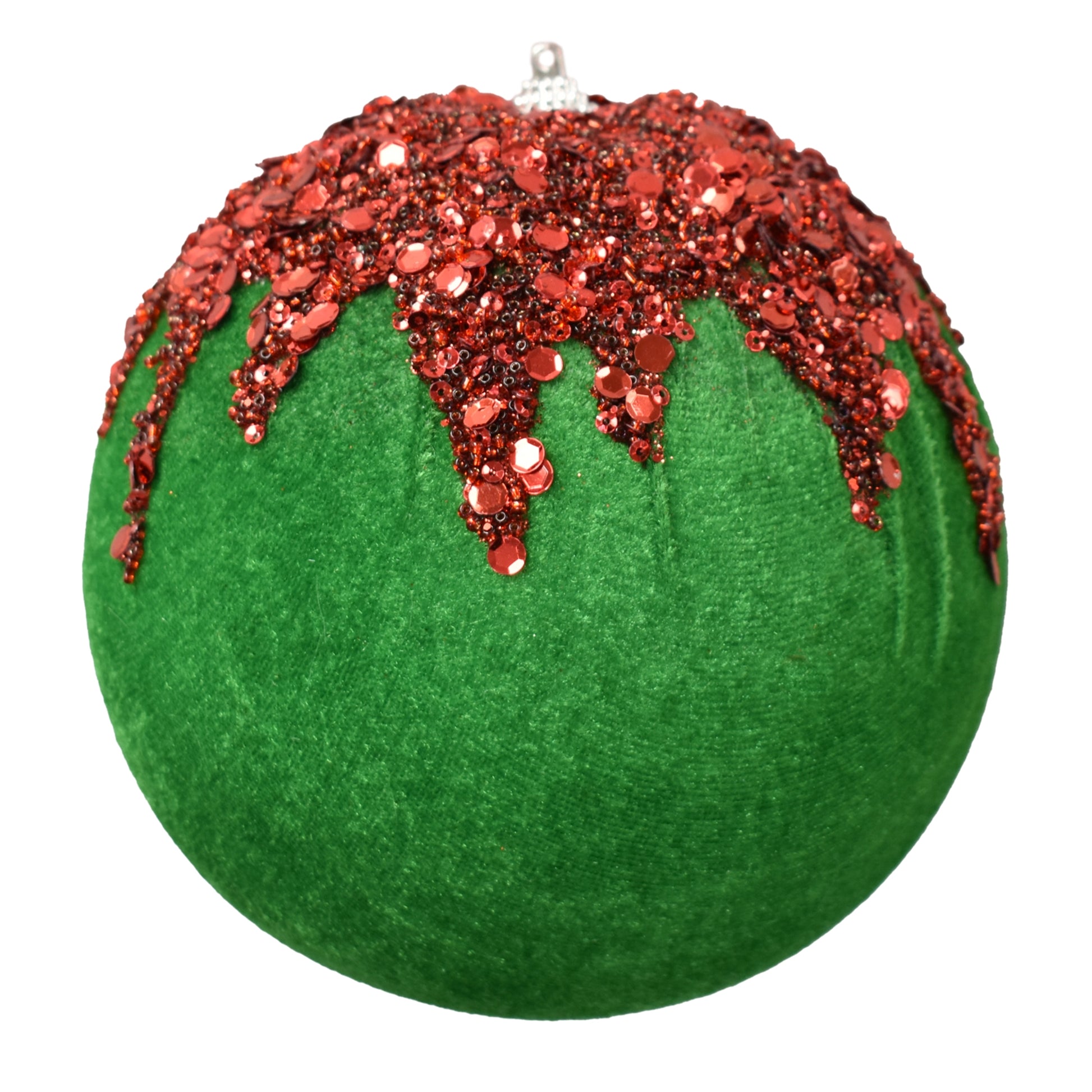 This 6 inch velvet ball with a unique dripping sequin design in light green and red is the perfect Christmas accent. Its vibrant colors and eye-catching design will add cheer and sparkle to your holiday decorations.