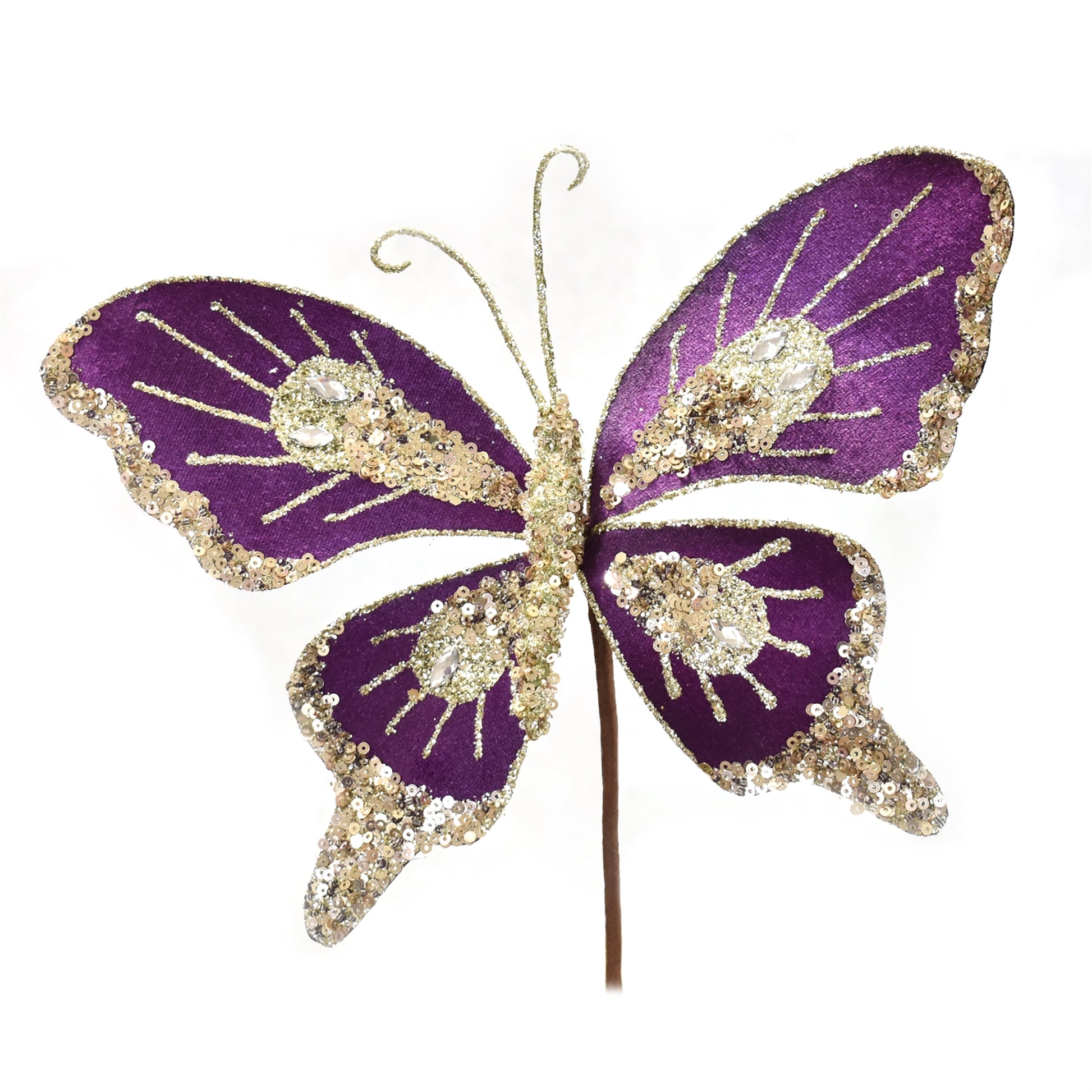 This sophisticated 9"-wide Velvet/Sequined Butterfly in Plum is made of durable, lightweight materials for superior performance and reliability. Its velvet and sequined design adds an ornate elegance, while its unique shape and color make it an eye-catching addition to any décor.