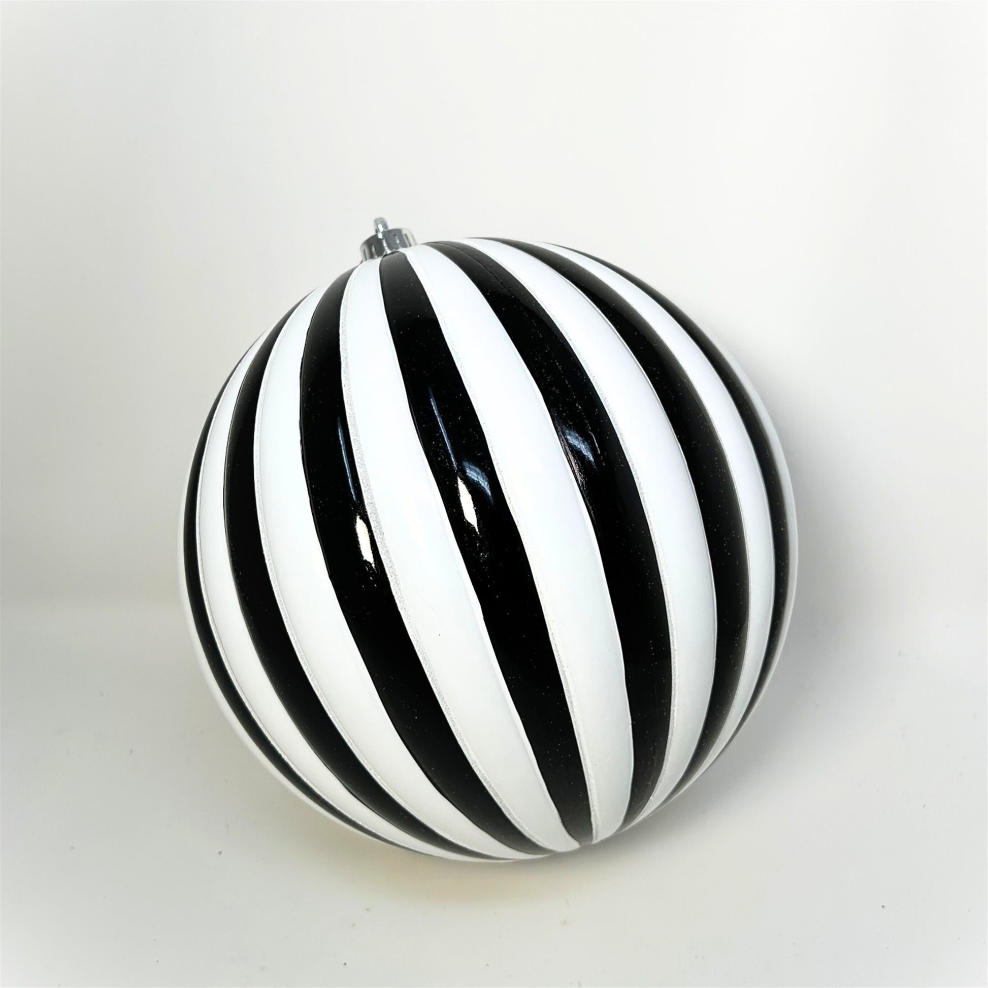 This 10" Vertical Striped Ball Ornament features sleek black and white stripes for a modern and sophisticated look. Made with durable materials, it will withstand the test of time and bring an elegant touch to your holiday decor. A must-have for any ornament collection.