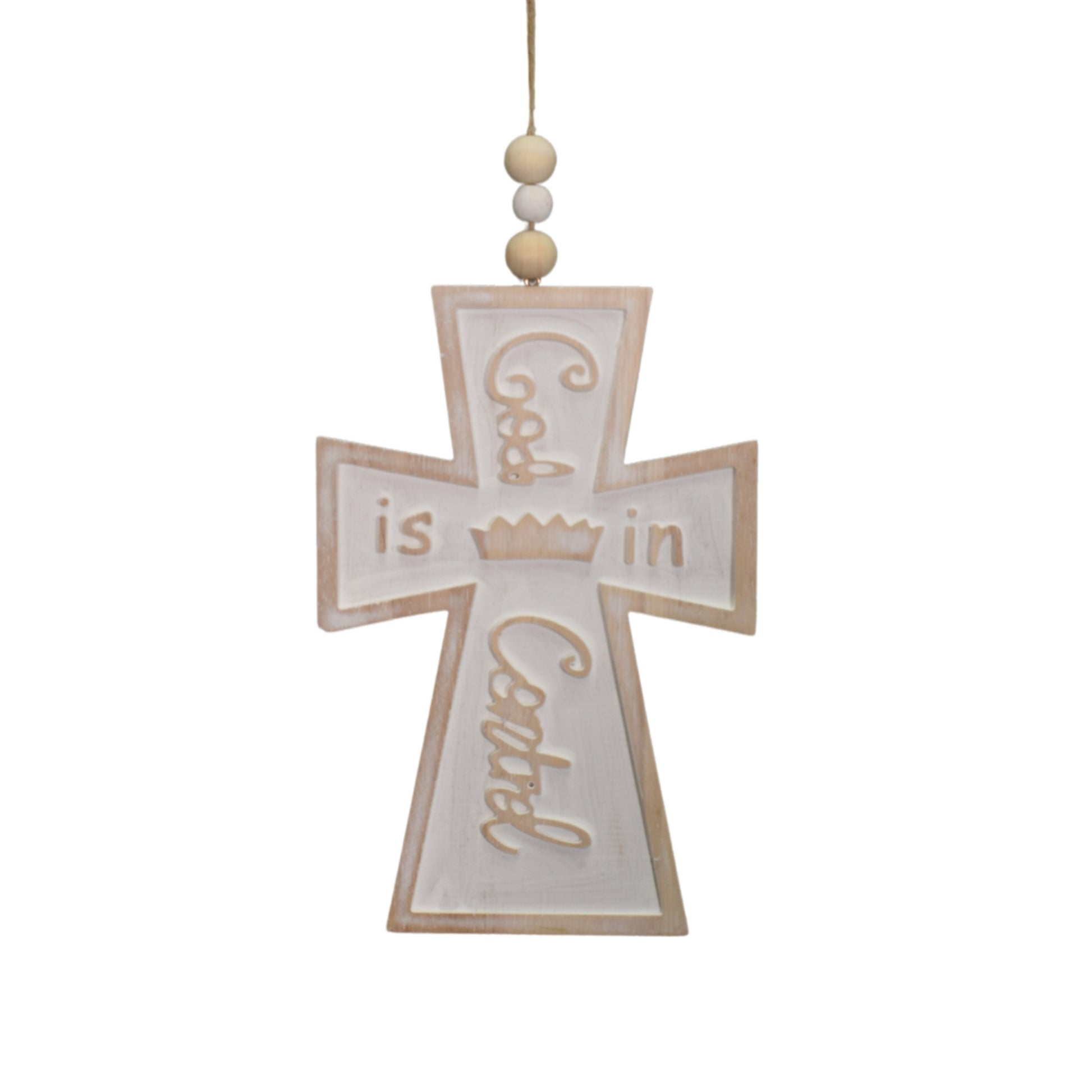 Wooden Whitewash "God is in Control" Cross Ornament 9.75" | TA